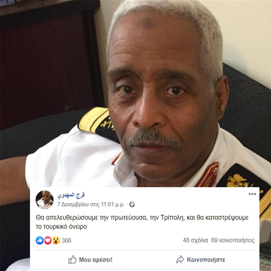 Mε μία ανάρτηση που προκαλεί αίσθηση, στον προσωπικό του λογαριασμό στο facebook, ο αρχηγός του Λιβυκού Στόλου ναύαρχος Φάρατζ ελ Μαχντάουϊ, εξέφρασε έντονα την αντίθεσή του στη Συμφωνία που υπέγραψε ο Ερντογάν με τον Φάγεζ αλ Σάρατζμ για τα θαλάσσια σύνορα. Ο ελληνομαθής ναύαρχος, έγραψε συγκεκριμένα σε άπταιστα ελληνικά: «Θα απελευθερώσουμε την πρωτεύουσα, την Τρίπολη, και θα καταστρέψουμε το τουρκικό όνειρο».