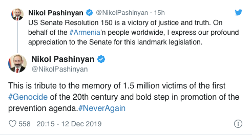 “Μια νίκη για τη δικαιοσύνη και την αλήθεια”. Με αυτόν τον τρόπο σχολίασε στο twitter ο Πρωθυπουργός της Αρμενίας, Νικόλ Πασινιάν, την απόφαση της Γερουσίας των Ηνωμένων Πολιτειών να αναγνωρίσει επισήμως τη γενοκτονία των Αρμενίων.