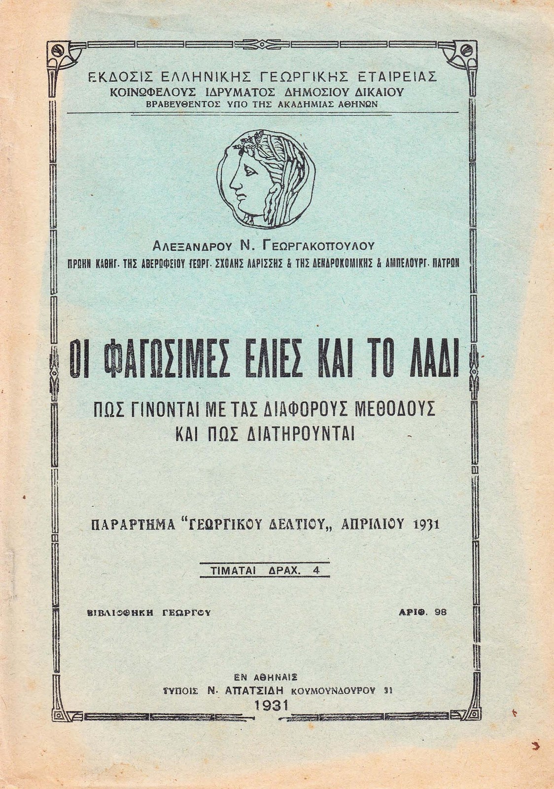 Λαδιού. Ξοδεύονται στην Αθήνα και γίνονται από τα σόγια μεγαρίτικες και αθηναϊκές. Για να τις φτιάσουν τις μαζεύουνε πράσινες, τις διαλέγουν και τις ξεπικρίζουν σε πήλινο αγγείο με καθαρό νερό πού αλλάζουνε κάθε μέρα. Το ξεπίκρισμα για πιο σύντομα μπορεί να γίνει, με κοινή ποτάσα. Όταν γλυκάνουν τις ρίχνουνε σ’ άρμη ίσαμε ν’ αλατιστούν κι’ από εκεί τις παίρνουν και μένα κοφτερό μαχαίρι τις χαράζουν του μάκρους σε 2-3 μεριές, κατόπι τις βάζουν για 2 το πολύ μέρες σε ξύδι και τελευταία σε γυάλινο ή πήλινο βάζο με λάδι. Το χάραγμα των ελιών μπορεί να γίνει και στην αρχή.