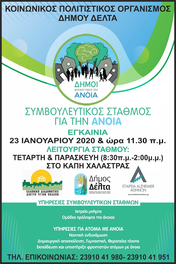 Ο Συμβουλευτικός Σταθμός για την υποστήριξη των πασχόντων από άνοια και των οικογενειών τους θα αρχίσει να λειτουργεί στον χώρο του Κ.Α.Π.Η Χαλάστρας του Δήμου Δέλτα, σε συνεργασία του Δήμου Δέλτα με το Ελληνικό Διαδημοτικό Δίκτυο Υγιών Πόλεων και την Εταιρεία Alzheimer.
