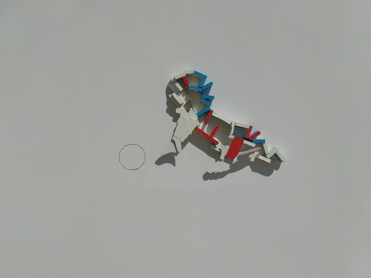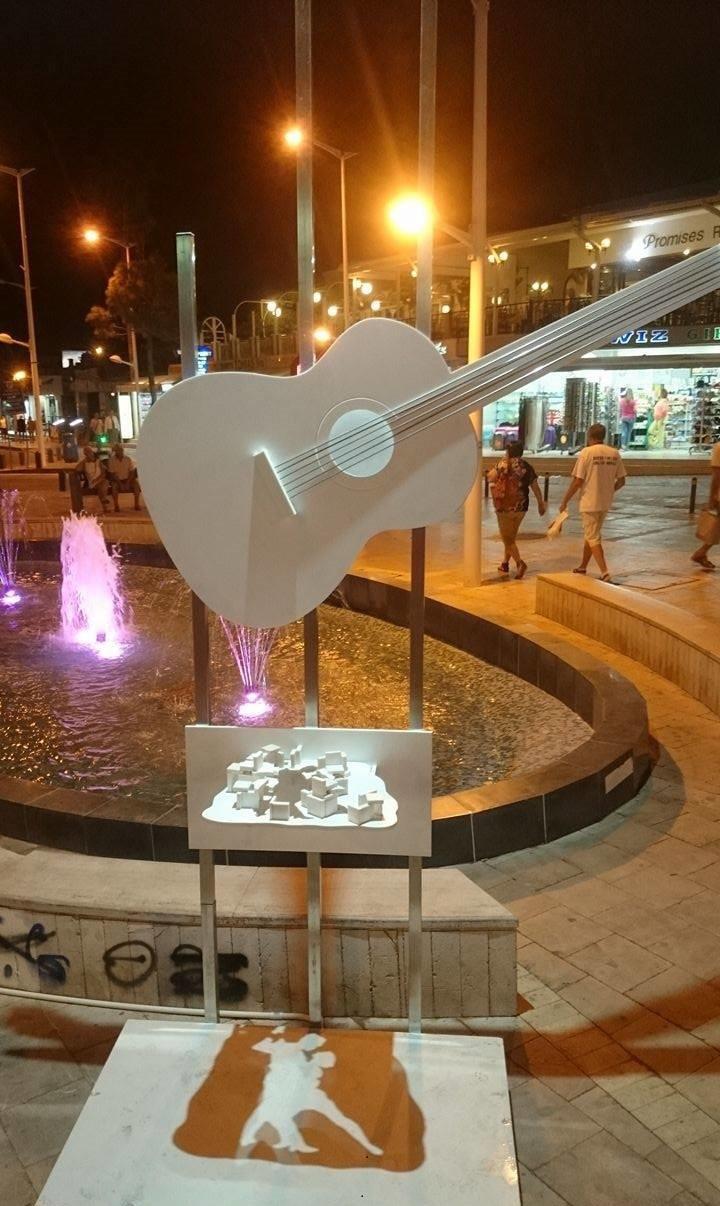 Έργο «Παθιασμένη Χορογραφία»… Αποτελείται από δύο τμήματα. Το ένα τμήμα είναι μια κιθάρα που στηρίζεται σε τρεις μεταλλικούς στύλους. Κάτω από την κιθάρα υπάρχει ένα περίεργο γλυπτό που παράγει τη σκιά ενός ζευγαριού που χορεύει…