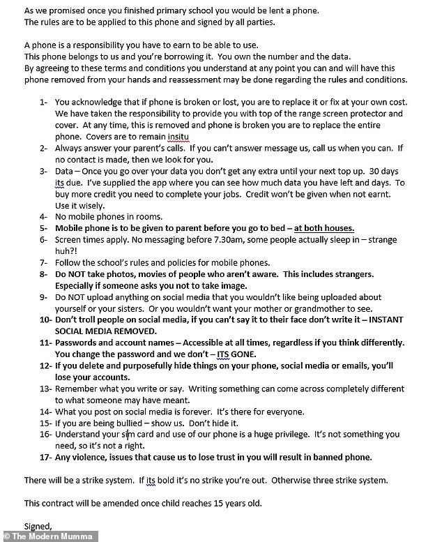 Οι κανόνες ήταν στο σύνολο 17 και μεταξύ άλλων απαιτούσαν το κλείσιμο της συσκευής πριν τον ύπνο και την πλήρη πρόσβαση της μητέρας στους κωδικούς του.