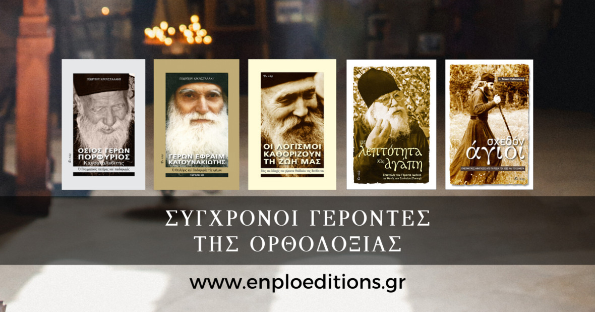 Ο βίος, οι δοκιμασίες, τα θαύματα, οι συμβουλές και νουθεσίες σύγχρονων Αγίων Γερόντων της Ορθόδοξης Εκκλησίας ανά τον κόσμο, μέσα από τις σελίδες επιλεγμένων βιβλίων των εκδόσεών μας!