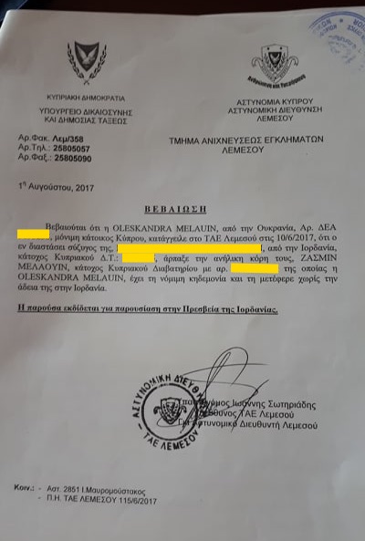 Αντίγραφο της καταγγελίας της απαγωγής στο ΤΑΕ Λεμεσού