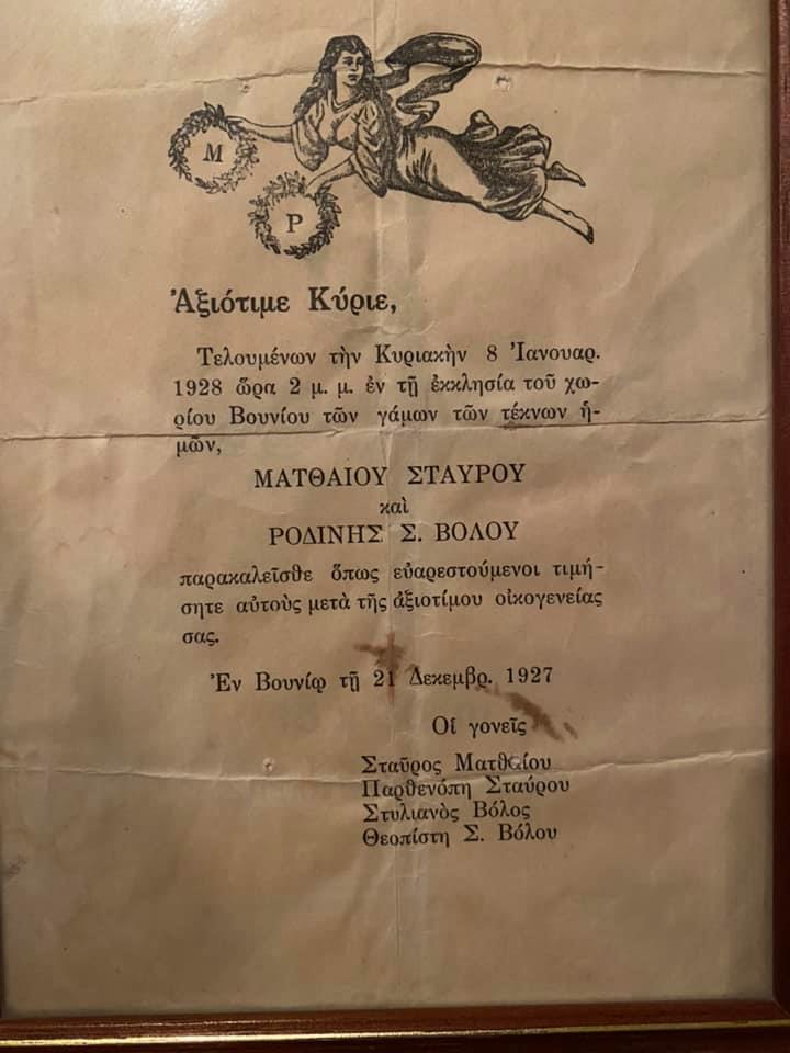 Η δημοσίευση του συγκεκριμένου προσκλητηρίου έγινε στην διαδικτυακή ομάδα Κάποτε στην Λεμεσό, όπου παρουσιάζει το γάμο του ζεύγους Ματθαίου Σταύρου – Ροδίνης Σ. Βόλου στο χωρίο Βουνί. Ο Γάμος έγινε στις 21 Δεκεμβρίου 1927!