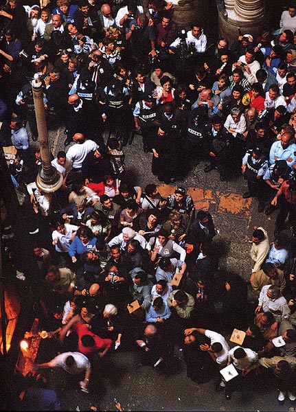 Όποτε ξανά ανέβαινε πάλι επάνω και αφού είδε και από είδε η καημένη, έδωσε και τα 33 κεράκια της σ’ άλλον και έβαλε τα κλάματα λέγοντας: «Εγώ τόσα χρόνια εργαζόμουνα και μάζευα δραχμή-δραχμή για να έλθω και ιδώ το Άγιο Φως και σήμερα να μη μπορώ να μπω μέσα; Θεέ μου και Χριστέ μου, γιατί μου κάνεις αυτό το κακό σήμερα;»