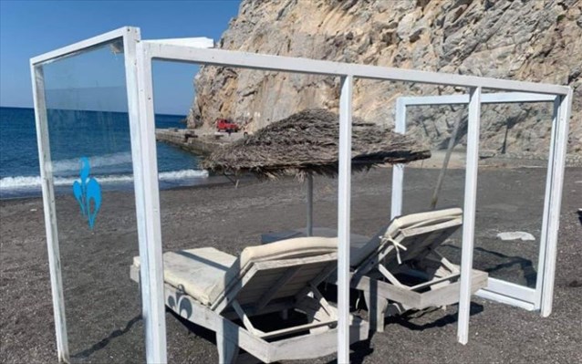 Με την πανδημία του κορωνοϊού να έχει δημιουργήσει νέα δεδομένα για τον ελληνικό τουρισμό, οι επιχειρήσεις στη Σαντορίνη, έναν από τος πιο δημοφιλείς νησιωτικούς προορισμούς της Ελλάδας, υιοθετούν μέτρα υγιεινής όλων των ειδών, ακόμη και διαχωριστικά από πλέξιγκλας στις παραλίες.
