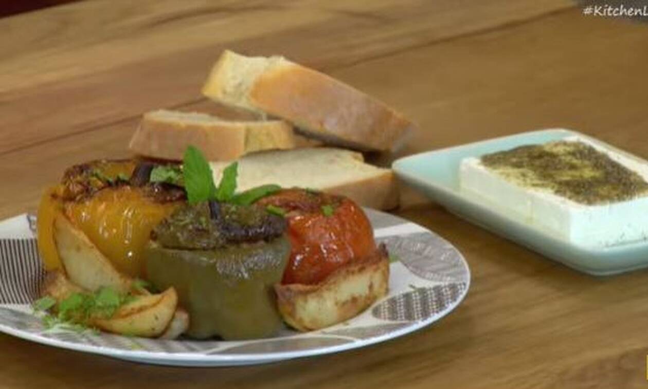 Κόβουμε τα καπάκια από τις πιπεριές, αφαιρούμε τα σπόρια και τις λευκές μεμβράνες. Κόβουμε λίγο τη βάση ώστε να μπορέσουν να κάτσουν όρθιες στο ταψί, χωρίς να δημιουργήσουμε τρύπα. Τις τοποθετούμε στο ίδιο ταψί.