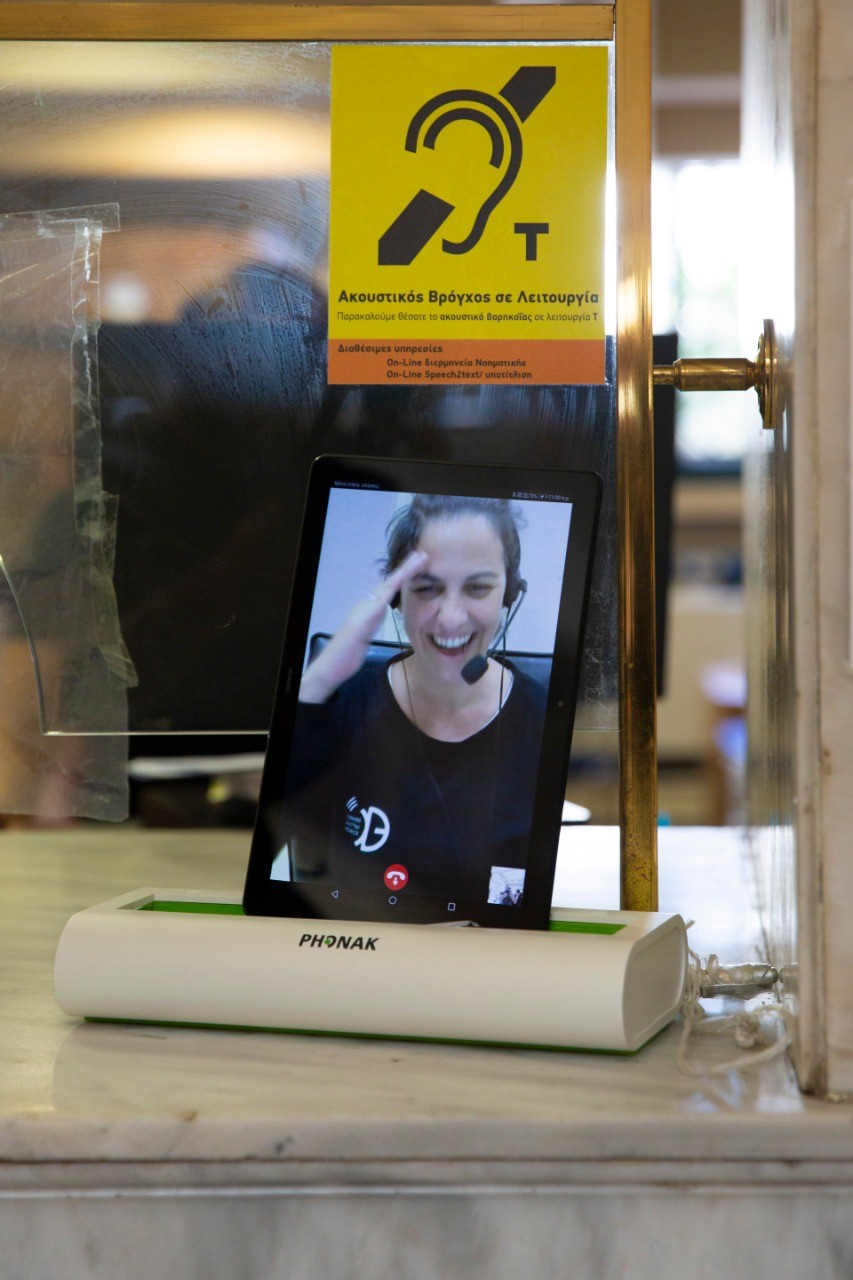 Ταυτόχρονα, ο χρήστης ακουστικών βαρηκοΐας/κοχλιακού εμφυτεύματος θα λαμβάνει ασύρματα την ομιλία του υπαλλήλου που τον εξυπηρετεί στη συσκευή του με υψηλή ευκρίνεια (τεχνολογία Τelecoil). Ο κωφός θα βρίσκεται μπροστά στο γκισέ, θα περιγράφει με βιντεοκλήση στον απομακρυσμένο διερμηνέα νοηματικής το αίτημά του και ο διερμηνέας ως ενδιάμεσος θα τα μεταφέρει στον υπάλληλο του Ληξιαρχείου και αντίστροφα (υπηρεσία IRIS/Relay Service). Επίσης, ο βαρήκοος/κωφός πολίτης θα διαβάζει σe tablet τον on line υποτιτλισμό της ομιλίας του υπαλλήλου (υπηρεσία Speech2text).