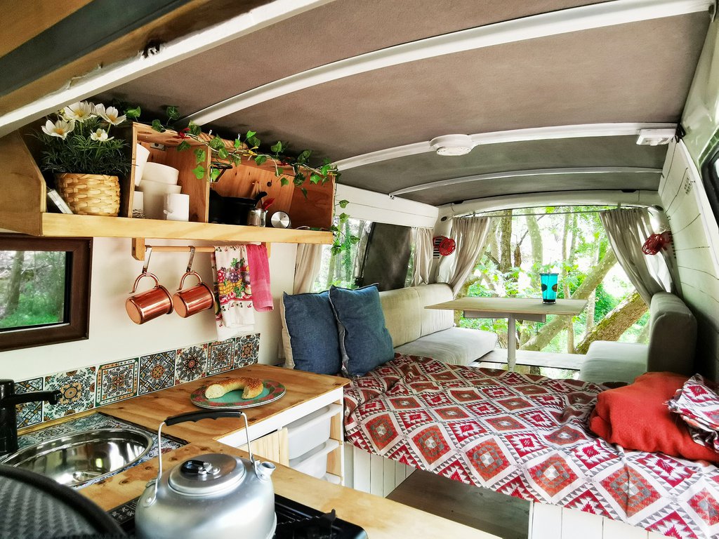 Στο βαν, αυτή τη στιγμή, υπάρχουν δύο καναπέδες μαζί με τραπέζι, τα οποία μετατρέπονται σε κρεβάτι, υπάρχει νεροχύτης με ηλεκτρική αντλία, μεγάλος πάγκος σε σχήμα Γ, για την προετοιμασία φαγητού ή ροφήματος, μάτι κουζίνας με γκάζι, μικρό ψυγείο 12v, δύο μικροί ανεμιστήρες, παρά πολλοί αποθηκευτικοί χώροι συρτάρια και φώτα σε όλο το χώρο. Η διαμόρφωση του χώρου έγινε με βάση τις ανάγκες και τις εμπειρίες μας, όλα τα προηγούμενα χρόνια, στο camping.