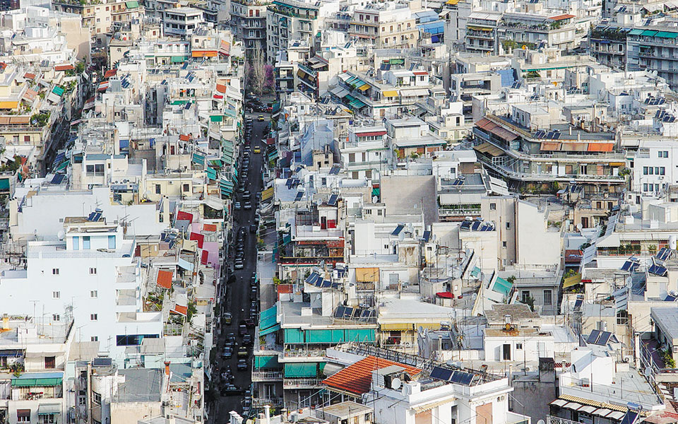 Πυκνός πολεοδομικός ιστός της Αθήνας με κυρίαρχη τη μορφή της μεταπολεμικής πολυκατοικίας.