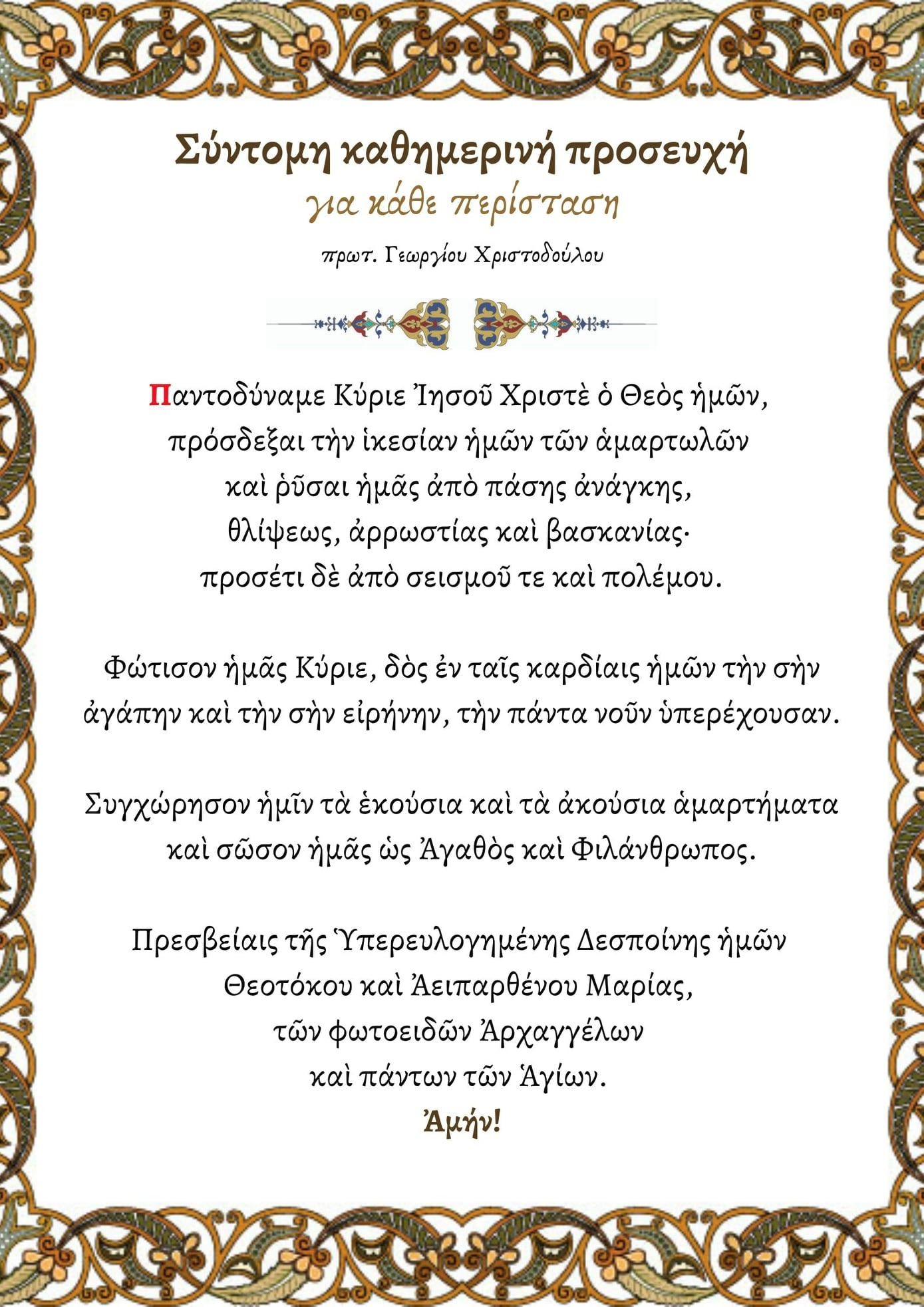 Φώτισον ημάς Κύριε, δος εν ταις καρδίαις ημών την σην αγάπην και την σην ειρήνην, την πάντα νουν υπερέχουσαν.