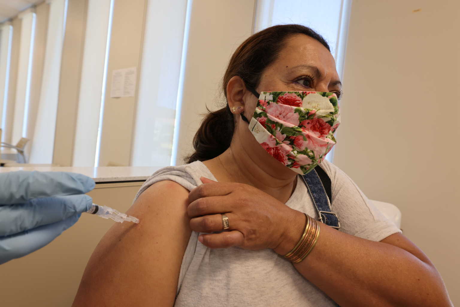 Rosa Hernandez, 56, is given a flu vaccine, during the global outbreak of the coronavirus disease (COVID-19), in East Los Angeles, California, U.S. November 9, 2020. REUTERS/Lucy Nicholson