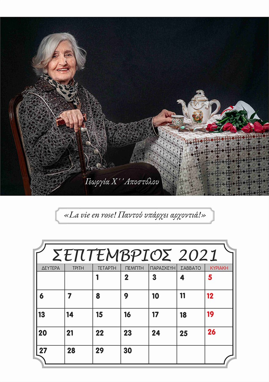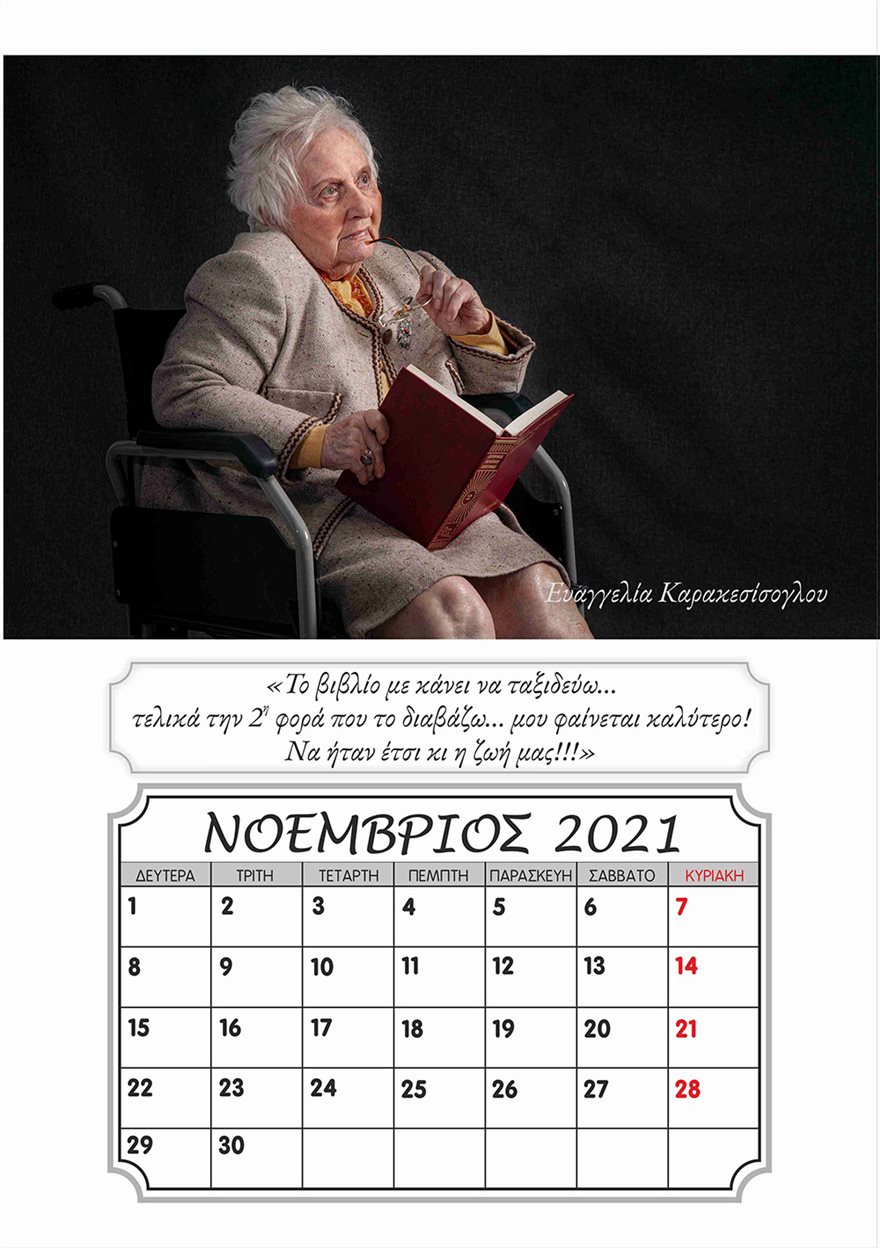 Μέσα από τις λεζάντες που συνοδεύουν τις φωτογραφίες τους, οι ένοικοι του γηροκομείου μοιράζονται τις σκέψεις τους κάνοντας κοινωνούς της ζωής τους τούς κατόχους του διαφορετικού αυτού ημερολογίου. «Ένα σφίξιμο χεριών …κι ένα σφίξιμο χειλιών», γράφει ο Θεόδωρος Παυλίδης, «Είμαι έτοιμη… κοιτάζω μπροστά αλλά πατάω γερά στο τώρα!», σημειώνει η Βασιλική Τσοκαλίδου, «Μια σύγχρονη μάγισσα της Σμύρνης: βλέπω μέσα σου, αν βλέπεις κι εσύ!» σημειώνει η Κουιμέτ Μουσταφά Ογλού, «Εμείς μαζί εδώ… αλλά και αλλού!» τονίζουν η Αθανασία και Θεόδωρος Παυλίδης, «Κάπου… κάποτε… παλιά… μεταξύ μας OMERTA!» αναφέρει ο Χαράλαμπος Καραβασίλογλου, «Πόσο αστεία είναι η ζωή τελικά!!! Αρκεί το αεράκι από τη βεντάλια μου να διώχνει κάθε κακό» αναφέρει η Αγαθή Ανδρεάδου, «Ένα τσιγάρο δρόμος είναι η ζωή! Ερωτευτείτε και θα κρατήσει περισσότερο!» παροτρύνει η Αθανασία Παυλίδου, «La vie en rose! Παντού υπάρχει αρχοντιά!» επισημαίνει η Γεωργία Χατζηαποστόλου, «Το βιβλίο με κάνει να ταξιδεύω… τελικά τη 2η φορά που το διαβάζω, μου φαίνεται καλύτερο! Να ήταν έτσι και η ζωή μας!!!» εύχεται η Ευαγγελία Καρακεσίσοσγλου.