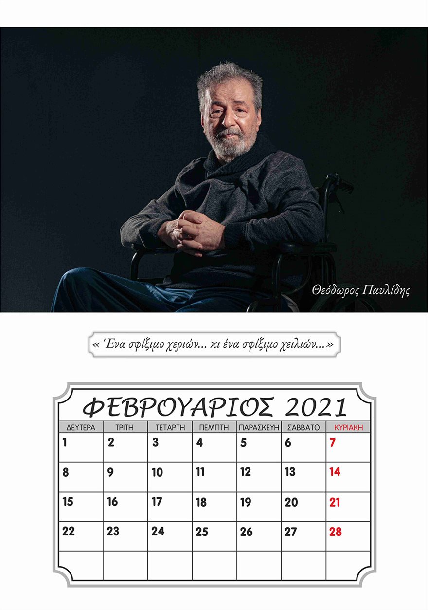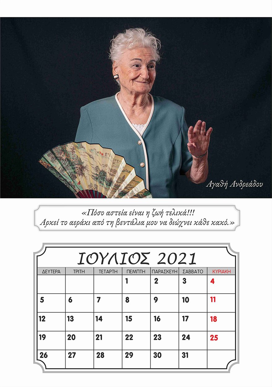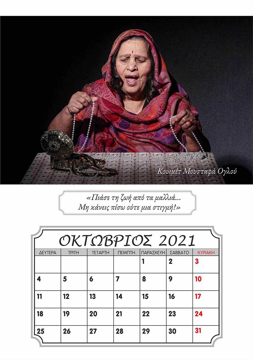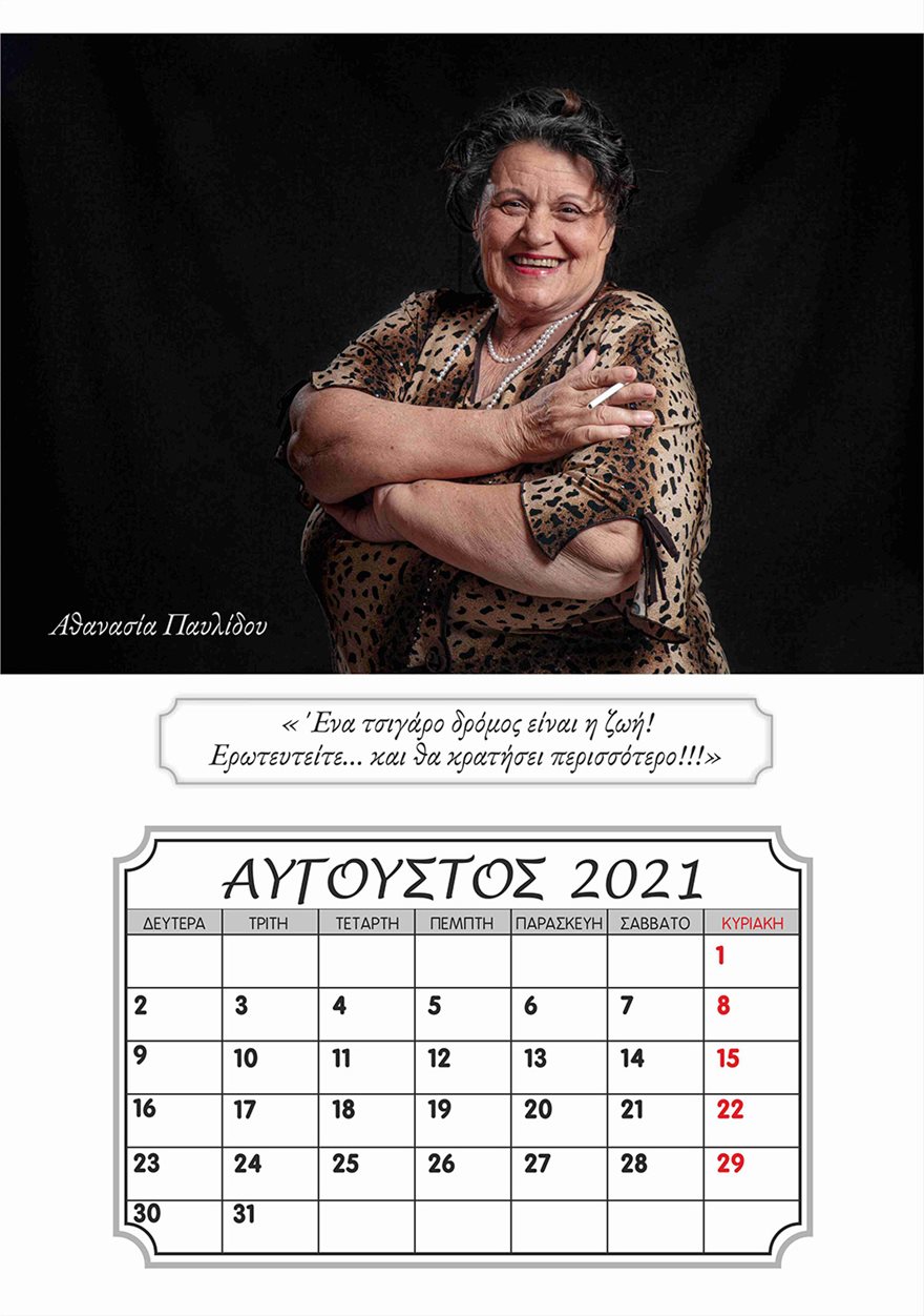 Μαζί με τους συνενοίκους της στο γηροκομείο, τον Λευτέρη Γιαγκίδη, που ποζάρει με το χαρακτηριστικό «καβουράκι» του και το κομπολόι στο χέρι στο εξώφυλλο του ημερολογίου, αλλά και τους Βασιλική Τσοκαλίδου, Κουιμέτ Μουσταφά Ογλού, Αθανασία και Θεόδωρο Παυλίδη, Χαράλαμπο Καραβασίλογλου, Αγαθή Ανδρεάδου, Γεωργία Χατζηαποστόλου και Ευαγγελία Καρακεσίσογλου, η Καλλιόπη Νάκου πόζαρε στον φακό της καλλιτεχνικής ομάδας φωτογραφίας του «ΕΡΓΑΣΤΗΡΙΟΥ ΦΩΤΟΓΡΑΦΙΑΣ», έτους 2019-2020, του Ιδρύματος Θρακικής Τέχνης και Παράδοσης (Ι.Θ.Π.Τ) Ξάνθης. Η καλλιτεχνική αυτή ομάδα μαζί με το γηροκομείο «Ο Μέγας Βασίλειος» και την εθελόντρια Σοφία Σαλβανά ένωσαν δυνάμεις και φαντασία και μεταμόρφωσαν τους ηλικιωμένους σε «πρωταγωνιστές σε πρώτο πλάνο»