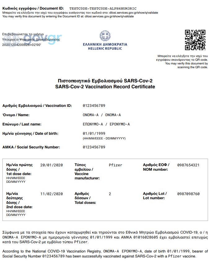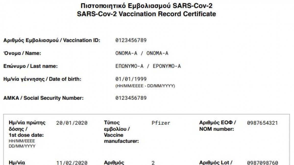 Στο έγγραφο υπάρχει το όνομα του πολίτη που έκανε το εμβόλιο, το ΑΜΚΑ του, το όνομα της εταιρείας του εμβολίου που έκανε, η ημερομηνία εμβολιασμού του αλλά και η ημερομηνίας της δεύτερης δόσης του εμβολίου.