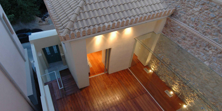 ώς συνδέονται τα δύο κτίρια; Καταρχάς με το ενιαίο πάτωμα, την επίστρωση όλων των δαπέδων με ξύλο, στο νεοκλασικό, στο νέο κτίσμα, στην αυλή, που ενώνει εσωτερικούς και εξωτερικούς χώρους αλλά και τα δύο κτίρια. Και έπειτα φυσικά με το διάδρομο που ξεκινάει από το ένα σπίτι και καταλήγει στο άλλο. Ενα διάδρομο ανοιχτό, διαφανή, μια ιδιαίτερη γυάλινη κατασκευή που συνδέει τα δύο κτίσματα.