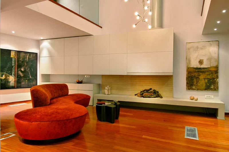 Το λιτό γραμμικό τζάκι είναι κυρίαρχο στοιχείο στο διώροφο χώρο.