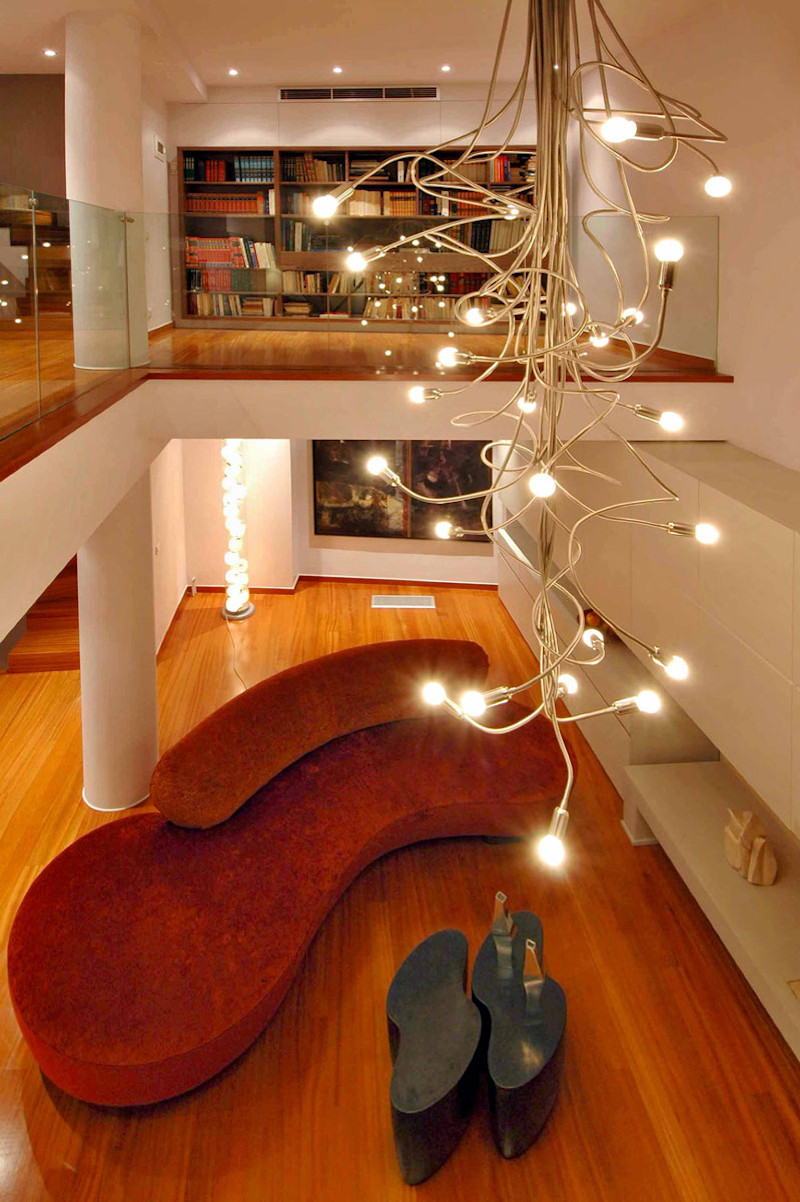 To καθιστικό εντυπωσιάζει με το μεγάλο ύψος ενώ τα έπιπλα και τα φωτιστικά συμβάλλουν στην ιδιαίτερη ατμόσφαιρά του.
