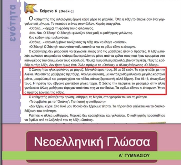 Ο λόγος για το βιβλίο της νεοελληνικής γλώσσας της Α’ Γυμνασίου, όπου αναλύεται η ερωτική σχέση ανάμεσα στον 25χρονο Σάκη και την 15χρονη μαθήτρια, Αλέκα. Το απόσπασμα βρίσκεται στη σελίδα 16 του βιβλίου, έχει τίτλο «Οσάκις» και είναι παρμένο από το βιβλίο «Γραφές της αθωότητας» της Ρούλας Κακλαμανάκη.