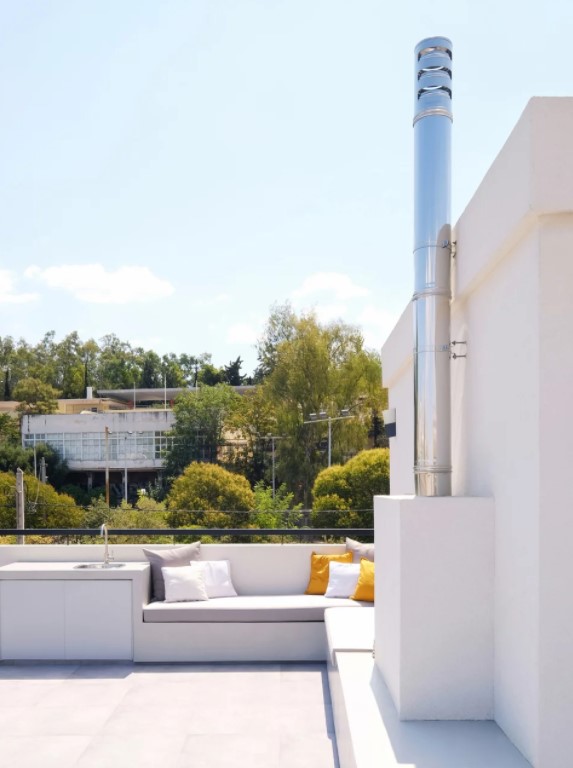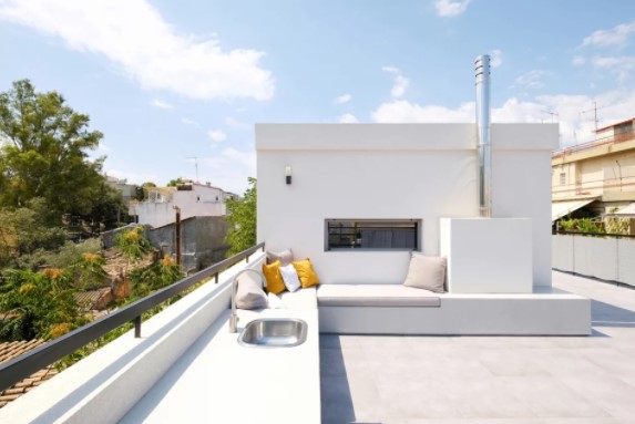 Χαρακτηριστικό του δώματος στα Πετράλωνα είναι ότι ακόμη και τα έπιπλα συμφωνούν με τις λιτές γραμμές της αρχιτεκτονικής και αποτελούν αναπόσπαστο κομμάτι. Μίνιμαλ με φωτεινά χρώματα όπως το λευκό και το κίτρινο, η θετική ενέργεια αναβλύζει από κάθε σημείο ενώ ο άπλετος εξωτερικός χώρος έχει σαφώς κυρίαρχη θέση.