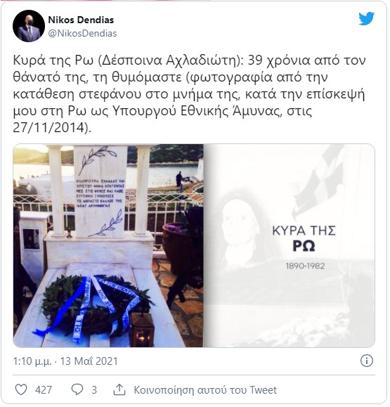 Μήνυμα για τα 39 χρόνια από το θάνατο της Κυράς της Ρω ανάρτησε στο λογαριασμό του στο twitter ο υπουργός Εξωτερικών Νίκος Δένδιας.