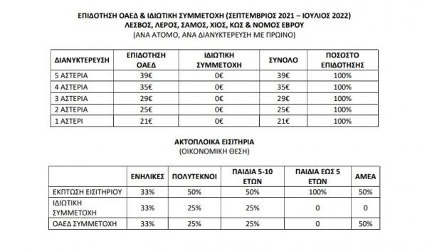 Για τα ακτοπλοϊκά εισιτήρια (μετ’ επιστροφής) το κόστος επιμερίζεται ως εξής: