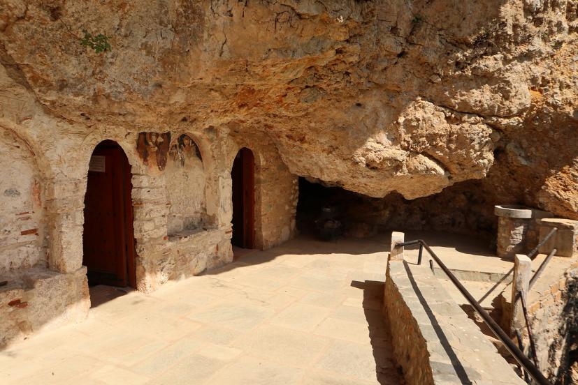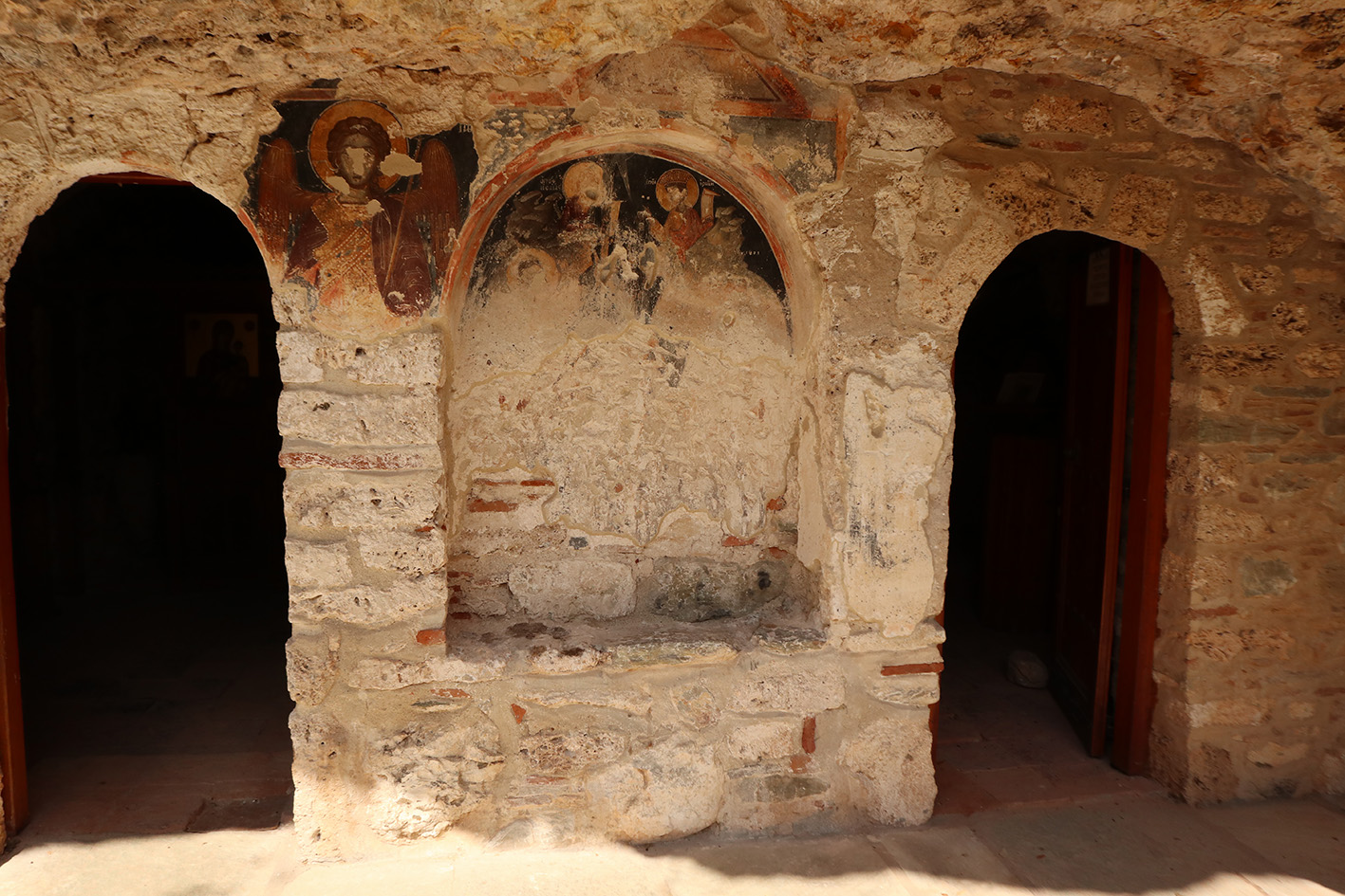 Απέναντι από το ποταμάκι μέσα στα κοιλώματα ψηλού βράχου, σώζονται τα δύο ασκηταριά της Μονής από το 12ο αι. με αγιογραφίες πάνω στον βράχο. Ο επισκέπτης μπορεί φτάσει και να δει από κοντά τα ασκηταριά, ανεβαίνοντας την πέτρινη και λαξευμένη στο βράχο σκαλωσιά.
