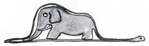 Όταν ήμουν ακόμη έξη χρονών, είδα μια υπέροχη ζωγραφιά σ’ ένα βιβλίο για το παρθένο δάσος, που είχε τον τίτλο «Αληθινές Ιστορίες». Έδειχνε ένα τεράστιο φίδι, το βόα, που καταβρόχθιζε κάποιο αγρίμι. Να ένα αντίγραφο κείνης της ζωγραφιάς.