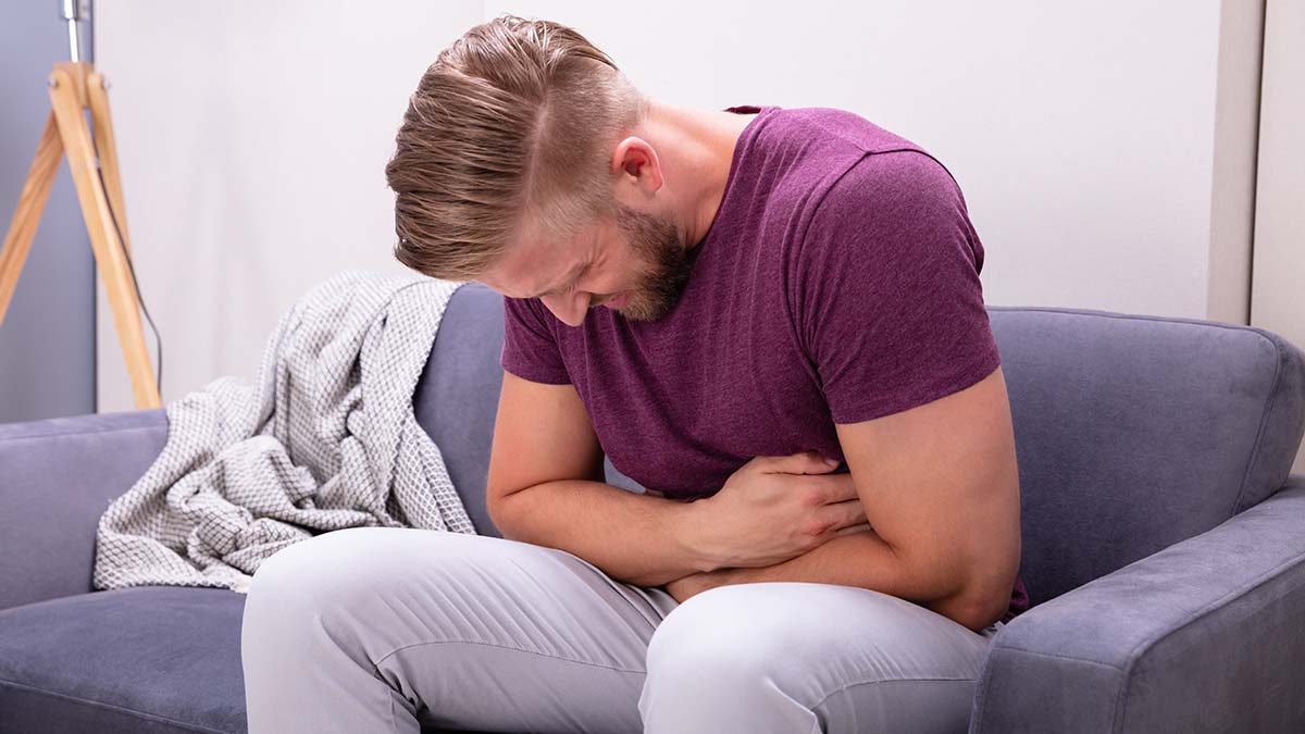 Young Man Suffering From Stomach Pain Sitting On Sofa At Home