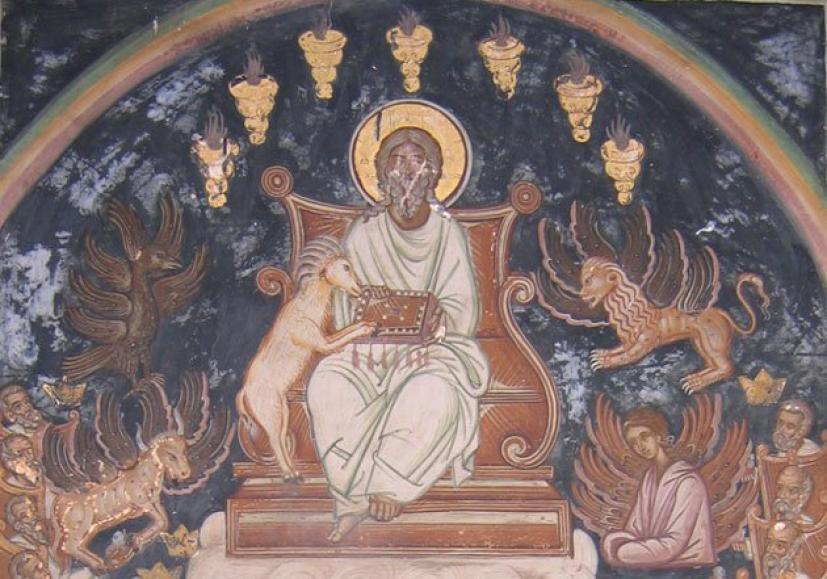 «και εν μέσω του θρόνου και κύκλω του θρόνου τέσσαρα ζωα γέμοντα οφθαλμών έμπροσθεν και όπισθεν· 7 και το ζωον το πρώτον όμοιον λέοντι, και το δεύτερον ζωον όμοιον μόσχω, και το τρίτον ζωον έχον το πρόσωπον ως ανθρώπου, και το τέταρτον ζωον όμοιον αετώ πετομένω. 8 και τα τέσσαρα ζωα, εν καθ’ εν αυτών έχον ανά πτέρυγας εξ, κυκλόθεν και έσωθεν γέμουσιν οφθαλμών, και ανάπαυσιν ουκ έχουσιν ημέρας και νυκτός λέγοντες· άγιος, άγιος, άγιος Κύριος ο Θεός ο παντοκράτωρ, ο ην και ο ων και ο ερχόμενος. 9 Και όταν δώσι τα ζωα δόξαν και τιμήν και ευχαριστίαν τω καθημένω επί του θρόνου, τω ζώντι εις τους αιώνας των αιώνων, 10 πεσούνται οι είκοσι τέσσαρες πρεσβύτεροι ενώπιον του καθημένου επί του θρόνου, και προσκυνήσουσι τω ζώντι εις τους αιώνας των αιώνων» (Αποκάλυψις 4/δ: 6-10).