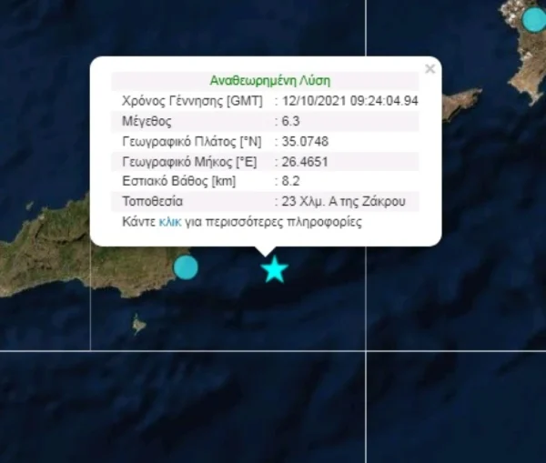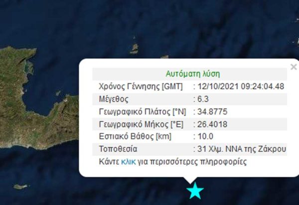 Ισχυρή σεισμική δόνηση 6,3 Ρίχτερ σημειώθηκε στις 12:24 το μεσημέρι, με επίκεντρο στα 23 χλμ ανατολικά της Ζάκρου στην Κρήτη, σύμφωνα με ηλεκτρονική καταγραφή του γεωδυναμικού Ινστιτούτου στην Αθήνα.