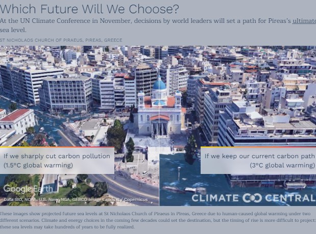 Δείτε πόσο απειλούνται ελληνικές παραθαλάσσιες πόλεις, όπως ο Πειραιάς και η Θεσσαλονίκη, από την κλιματική αλλαγή.