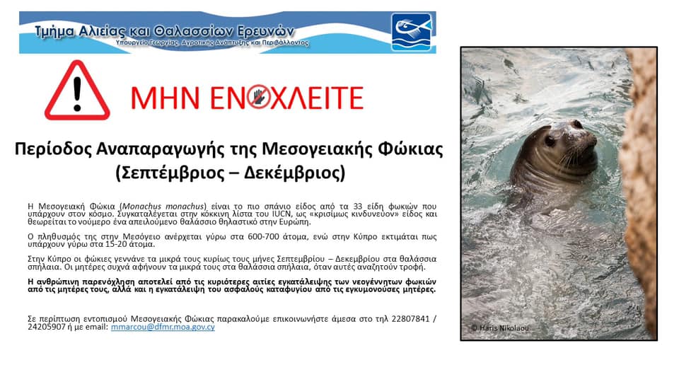 Το Τμήμα Αλιείας και Θαλασσίων Ερευνών μέσω μίας ανακοίνωσής του καλεί το κοινό να είναι ιδιαίτερα προσεκτικό και να μην ενοχλεί τις μεσογειακές φώκιες, οι οποίες αναπαράγονται από τον Σεπτέμβριο μέχρι τον Οκτώβριο. Το σπάνιο είδος της Μεσογειακής Φώκιας αριθμεί περίπου 15-20 άτομα στην Κύπρο και η προστασία του είναι εξαιρετικά σημαντική για την επιβίωση του πληθυσμού.