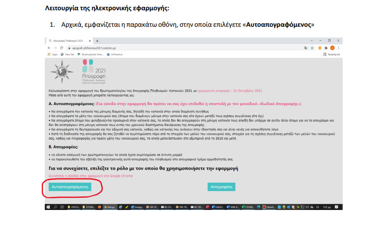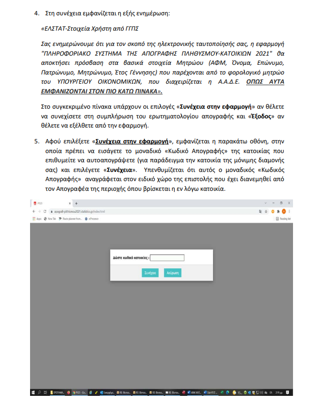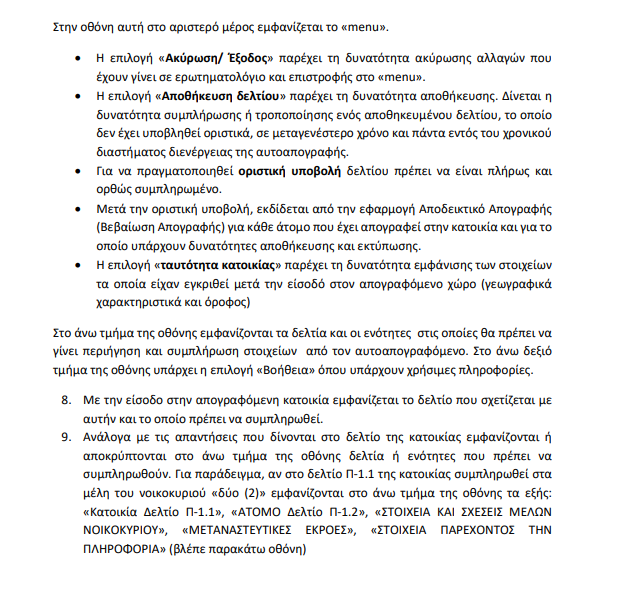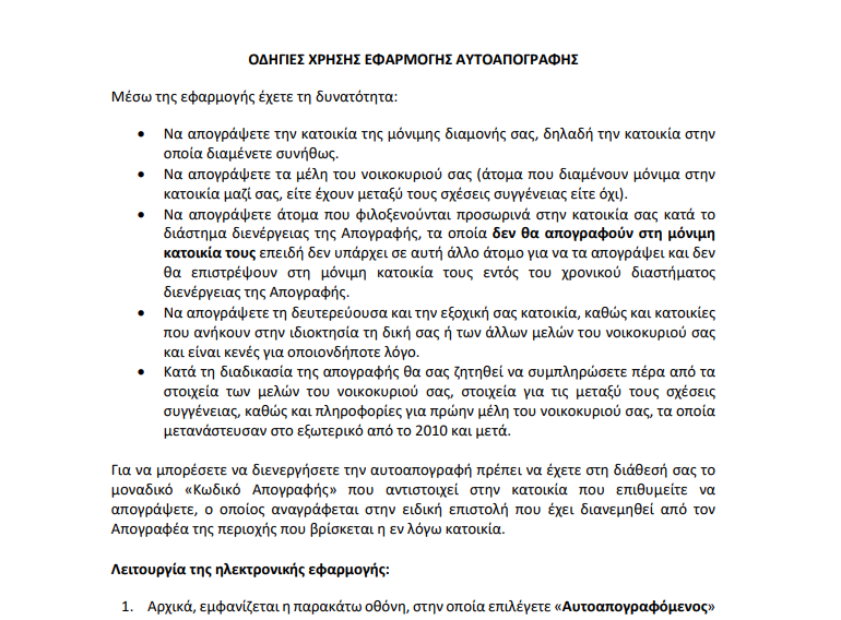 Ήδη στις κατοικίες ανά την επικράτεια, παραδίδεται από τους απογραφείς ενημερωτικό έντυπο με τον «Κωδικό Απογραφής» για την είσοδο στην ηλεκτρονική υπηρεσία αυτοαπογραφής του gov.gr.