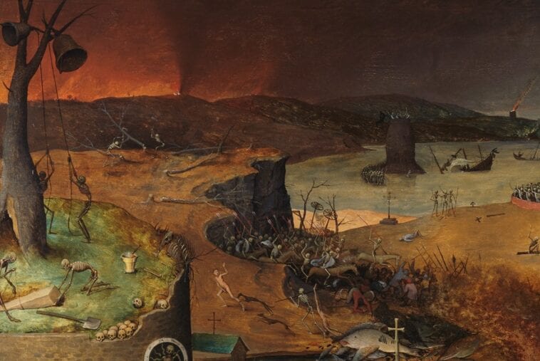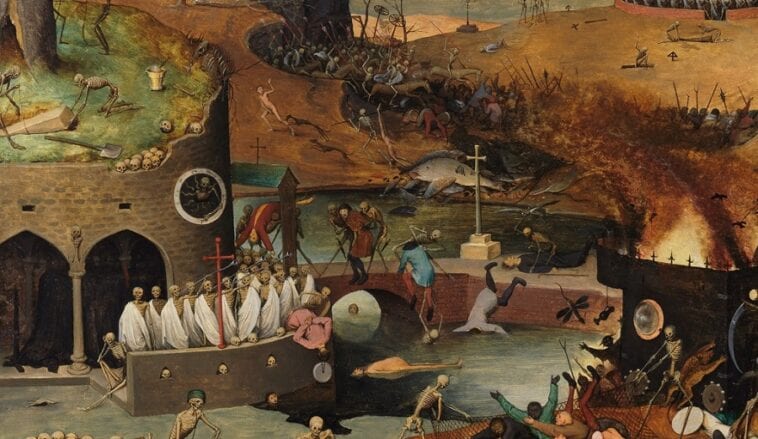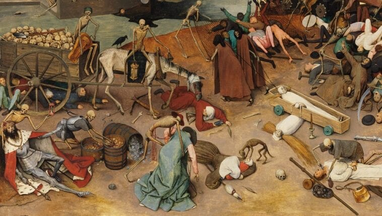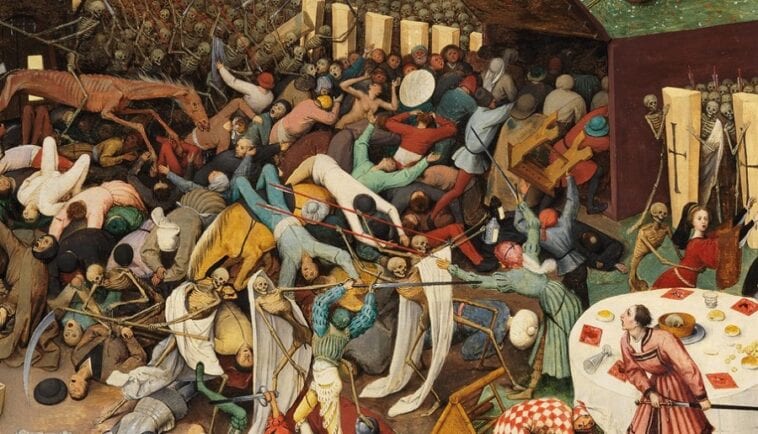 O πίνακας του Bruegel δείχνει τον “στρατό” της βουβωνικής πανώλης: χιλιάδες σκελετοί με όπλα, να σκορπούν τον θάνατο στο διάβα τους, διαμελίζοντας τον κόσμο που τρέχει να κρυφτεί σε μια καταπακτή.. Η λεπτομέρεια των σκηνών είναι ανατριχιαστική.