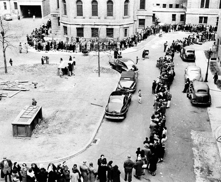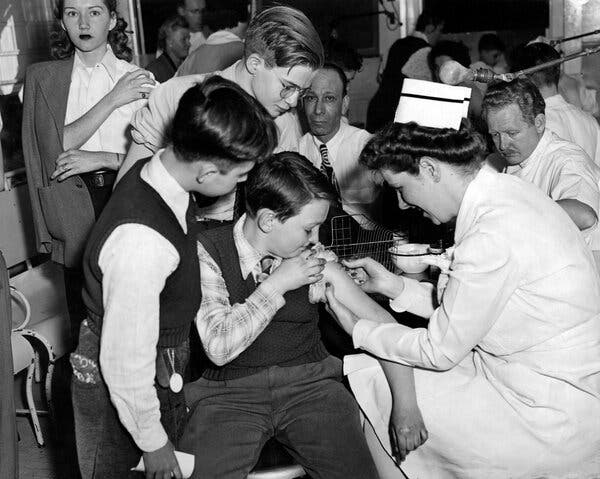 Αυτή η χαρακτηριστική φωτογραφία είναι από κέντρο εμβολιασμού στην Ν. Υόρκη. Πολίτες περιμένουν υπομονετικά να εμβολιαστούν με κάτι που θα τους κάνει επιτέλους ανίκητους στον θανατηφόρο ιό. Στα επόμενα 30 χρόνια οι εμβολιασμοί συνεχίζονταν, με ό,τι μέσα διέθεταν τα κράτη..