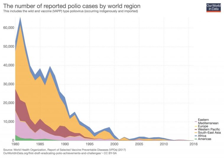 Το 1955 βγάλαμε εμβόλιο εναντίον πολιομυελίτιδας και παντού εμβολιάζονται παιδιά. Από 200.000 κρούσματα το χρόνο παγκοσμίως, σήμερα έχουμε μόλις λίγες εκατοντάδες και μόνο σε 2 χώρες (Αφγανιστάν και Πακιστάν). Σε λίγα χρόνια θα εξαλειφθεί και ο ιός της πολιομυελίτιδας, όπως και αυτός της ευλογιάς! Άλλες 6 μεταδοτικές ασθένειες είναι κοντά στην ολοκληρωτική εξάλειψη από προσώπου γης, μεταξύ των οποίων η διφθερίτιδα, η ερυθρά, η παρωτίδιδα, o κοκκύτης και η ιλαρά.