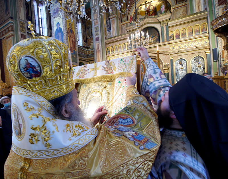 Μετά το πέρας της θείας Λειτουργίας, ο Σεβασμιώτατος, με συγκίνηση και υιική αγάπη προς το πρόσωπο της Υπεραγίας Θεοτόκου, κατέθεσε στην Ιερά Εικόνα ένα Αρχιερατικό του εγκόλπιο.