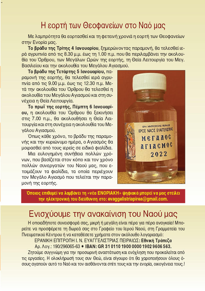 Ενημερωτική έκδοση Ιερού Ναού Ευαγγελιστρίας Πειραιώς (τευχ. 308) 3 Ιανουαρίου 2022 Tags:«ΕΝΟΡΙΑ εν δράσει…»ΕκδόσειςΕνοριακή