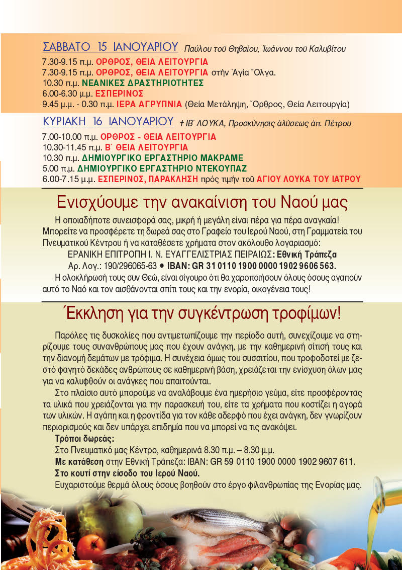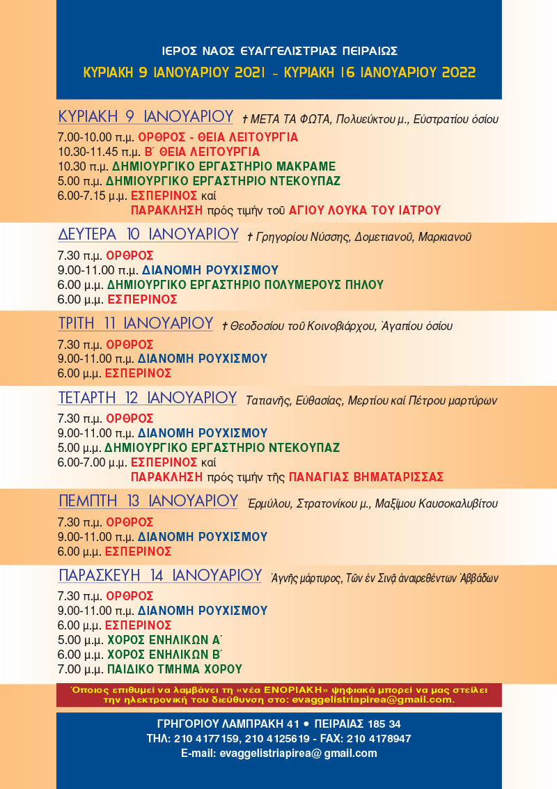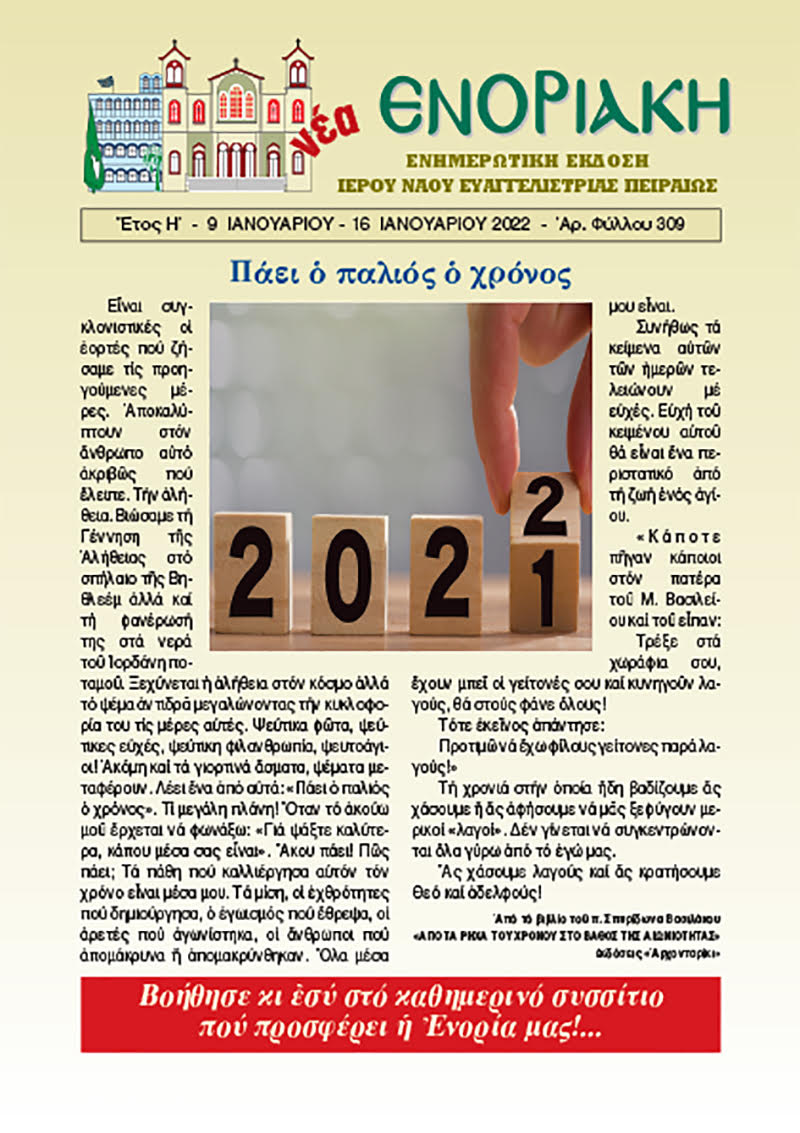 Ενημερωτική έκδοση Ιερού Ναού Ευαγγελιστρίας Πειραιώς. Νο 309 8 Ιανουαρίου 2022 Tags:«ΕΝΟΡΙΑ εν δράσει…»«Νέα Ενοριακή»Εκδόσεις