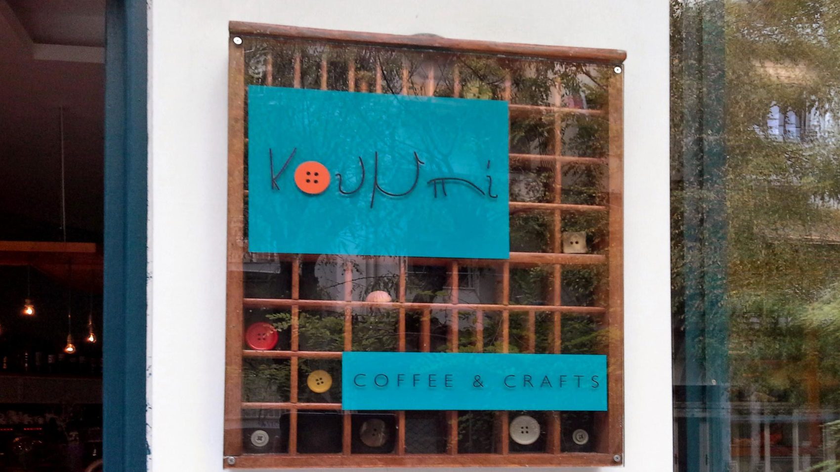 “Το Κουμπί” πήρε το όνομά του από το γεγονός ότι ο προηγούμενος νοικάτης έβαφε κουμπιά. Το “Coffee and Crafts” είναι οι σύγχρονες προσθήκες.