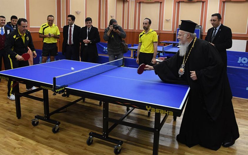 Πινγκ πονγκ έπαιξε ο Οικουμενικός Πατριάρχης Βαρθολομαίος, o οποίος βρέθηκε για την κοπή της πίτας στον αθλητικό σύλλογο του Πέρα. Σημειώνεται ότι πριν από 2 μήνες ο Οικουμενικός Πατριάρχης υποβλήθηκε σε επέμβαση στις ΗΠΑ και πριν 15 μέρες νόσησε με κορωνοϊό.