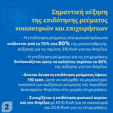 Η επιδότηση ρεύματος στα φυσικά πρόσωπα αυξάνεται από το 70% στο 80% μεσοσταθμικά της αύξησης για τις πρώτες 310 Kwh (90% για τις πρώτες 155 Kwh και 70% για 156-310 Kwh) για τον Απρίλιο με κόστος 218 εκατ. ευρώ.
