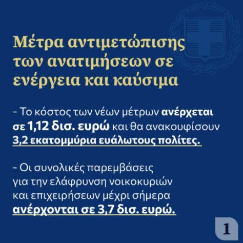 Με βάση τα ανωτέρω, το σύνολο των παρεμβάσεων για την ελάφρυνση νοικοκυριών και επιχειρήσεων που έχουν ανακοινωθεί ή υλοποιηθεί έως σήμερα ανέρχεται σε 3,7 δισ. ευρώ.