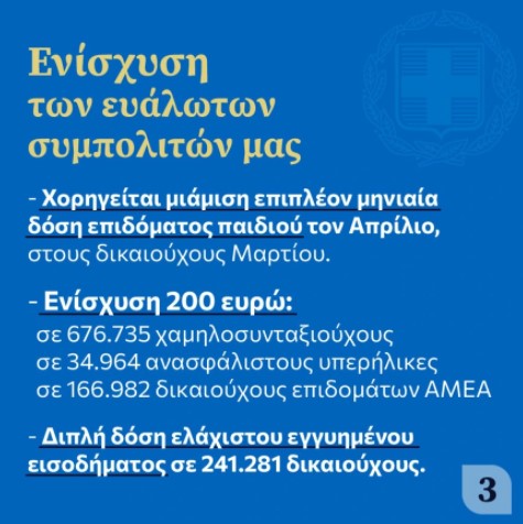 Ενίσχυση 200 ευρώ σε 676.735 χαμηλοσυνταξιούχους. Δικαιούχοι είναι (όπως τον Δεκέμβριο) συνταξιούχοι που έχουν ετήσιο ατομικό φορολογητέο εισόδημα φορολογικού έτους 2020 έως 7.200 ευρώ (600 ευρώ μηνιαίως), ετήσιο οικογενειακό φορολογητέο εισόδημα έως 14.400 ευρώ και η συνολική φορολογητέα αξία της ακίνητης περιουσίας του νοικοκυριού δεν υπερβαίνει τα 200.000 ευρώ. Το κόστος υπολογίζεται σε 135 εκατ. ευρώ.