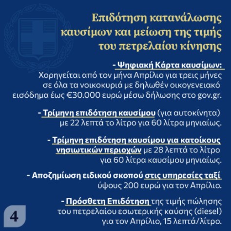 Κάρτα καυσίμων: Χορηγείται κατά τον μήνα Απρίλιο επιδότηση καυσίμων (αμόλυβδης και πετρελαίου κίνησης) που καλύπτει το αυξημένο κόστος των καταναλώσεων τριών μηνών (Απριλίου, Μαΐου και Ιουνίου) για φυσικά πρόσωπα (συμπεριλαμβανομένων ελευθέρων επαγγελματιών), με τα ακόλουθα χαρακτηριστικά:
