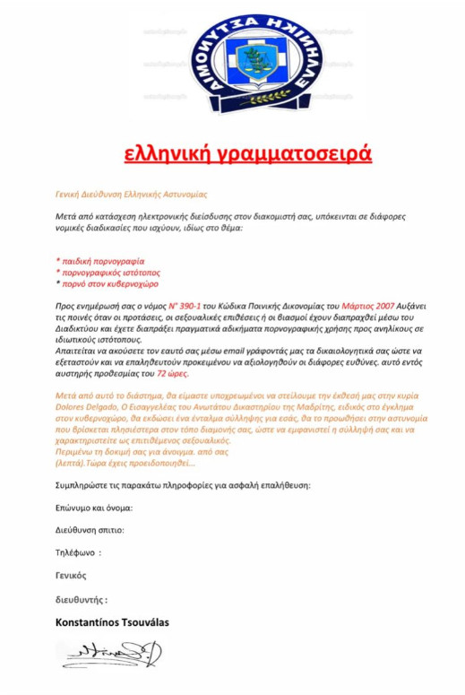 Ειδικότερα, το Αρχηγείο της Ελληνικής Αστυνομίας υπογραμμίζει ότι «το κείμενο – μήνυμα, που διακινείται μέσω ηλεκτρονικού ταχυδρομείου, ως δήθεν επιστολή της Ελληνικής Αστυνομίας, είναι καταφανώς ψευδεπίγραφο και απατηλό και αποστέλλεται από δράστες που επιχειρούν προφανώς να εξαπατήσουν – παραπλανήσουν τους πολίτες».