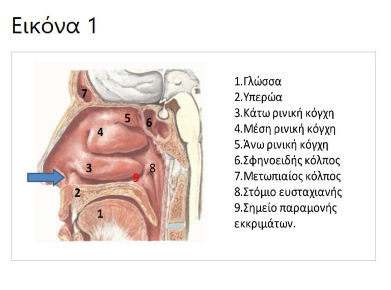 Ακριβώς η ίδια φιλοσοφία είναι και με τις ρινοπλύσεις. Οποιαδήποτε συσκευή χρησιμοποιούμε (αμπούλα, σύριγγα, ή άλλα συστήματα ρινοπλύσεων), η φορά του νερού θα είναι όπως αυτή του βέλους της εικόνας 1, για να κατευθύνει το νερό στο σημείο 9 που λιμνάζουν οι εκκρίσεις. Σε καμία περίπτωση δεν ασκούμε μεγάλη πίεση για να γίνει ο καθαρισμός, διότι πίσω από το σημείο 9, είναι το ανατομικό σημείο 8, που είναι το στόμιο της ευσταχιανής σάλπιγγας η οποία ενώνει τη μύτη του παιδιού με το αυτί. Η μεγάλη πίεση στη ροή του νερού, μπορεί να διανοίξει την ευσταχιανή, να περάσει νερό στο μέσο αυτί, να πονέσει το παιδί, να μετακινηθεί το τύμπανο προς τα έξω, να παραμείνει υγρό στο μέσο αυτί, ακόμα και να προκαλέσει στο παιδί συχνές ωτίτιδες.