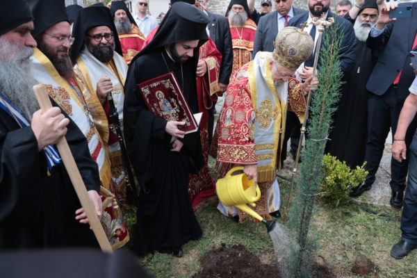 Ο Παναγιώτατος προς τιμήν της επισκέψεώς του φύτευσε ένα δέντρο στο προαύλιο χώρο του Πρωτάτου.